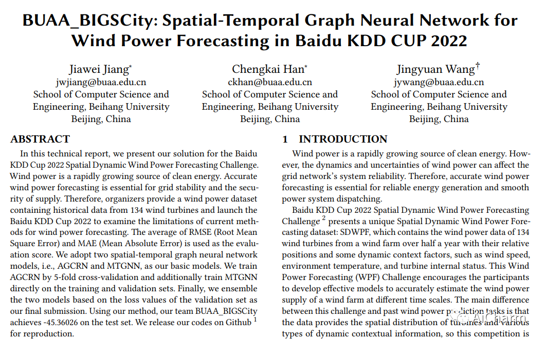 标题:BUAA_BIGSCity:百度KDD CUP 2022风电预测时空图神经网络