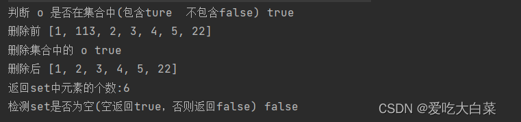 public static void main(String[] args) {Set set=new HashSet<>();int[] testArray={1,2,3,2,4,5,2,22,113,5,2,1};//add()函数使用for (int x:testArray) {set.add(x);}System.out.println("判断 o 是否在集合中(包含ture 不包含false)"+" "+set.contains(2));System.out.println("删除前"+" "+set);System.out.println("删除集合中的 o"+" "+set.remove(113));System.out.println("删除后"+" "+set);System.out.println("返回set中元素的个数:"+set.size());System.out.println("检测set是否为空(空返回true,否则返回false)"+" "+set.isEmpty());}