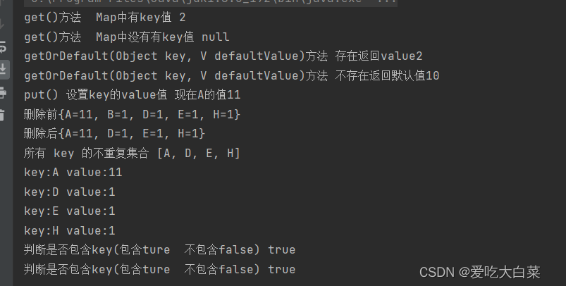 public static void main(String[] args) {Map map=new HashMap<>();char[] testCh={'A','B','D','A','E','H'};for (char ch:testCh) {if(map.get(ch) == null) {map.put(ch,1);}else {int val = map.get(ch);map.put(ch,val+1);}}System.out.println("get()方法 Map中有key值"+" "+ map.get('A'));System.out.println("get()方法 Map中没有有key值"+" "+ map.get('F'));System.out.println("getOrDefault(Object key, V defaultValue)方法 存在返回value"+map.getOrDefault('A',10));System.out.println("getOrDefault(Object key, V defaultValue)方法 不存在返回默认值"+map.getOrDefault('F',10));map.put('A',11);System.out.println("put() 设置key的value值"+" 现在A的值"+map.get('A'));System.out.println("删除前"+map);map.remove('B');System.out.println("删除后"+map);Set a= map.keySet();System.out.println("所有 key 的不重复集合 "+a);for (Map.Entry x:map.entrySet()) {System.out.println("key:" + x.getKey()+ " "+ "value:"+ x.getValue());}System.out.println("判断是否包含key(包含ture 不包含false)"+" "+map.containsKey('A'));System.out.println("判断是否包含key(包含ture 不包含false)"+" "+map.containsValue(11));}