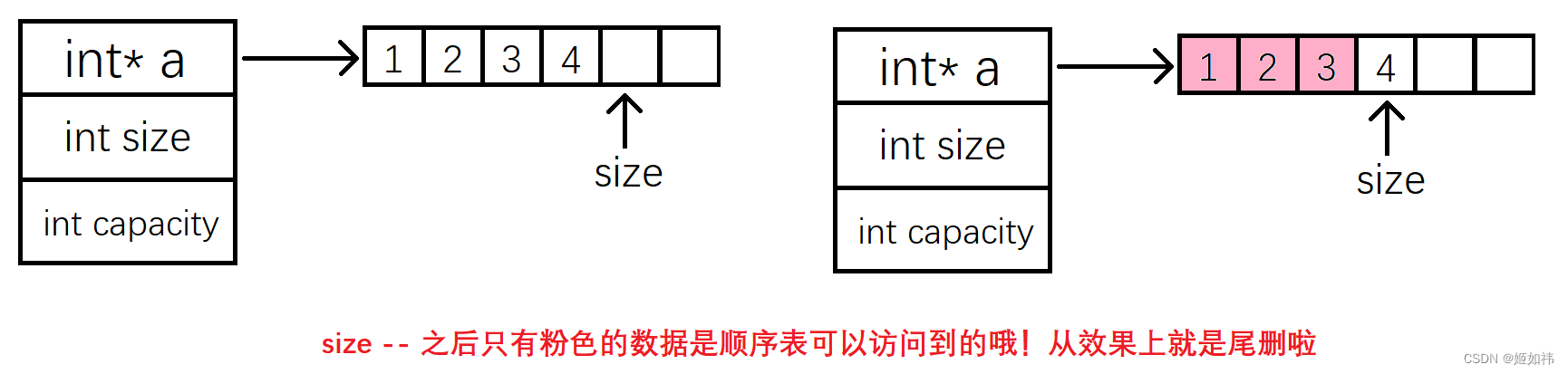 这是顺序表的尾删哈,这个就更简单了,只要将 size-- 就行,原因就是我们访问数据只能访问到下标小于size的哒。还有一点就是如果顺序表为空,即size == 0 是不允许删除数据的哦!