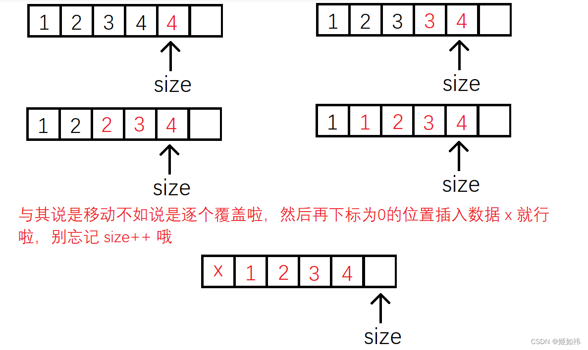 这里和头插一样同样需要移动数据只不过是从前往后移动数据。这里就不画图演示了!!!头删之后记得将 size-- 哦!!还有一点,没有数据不允许删除数据哦!
