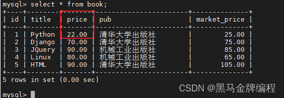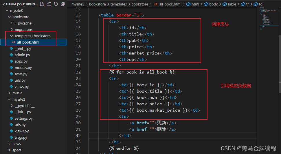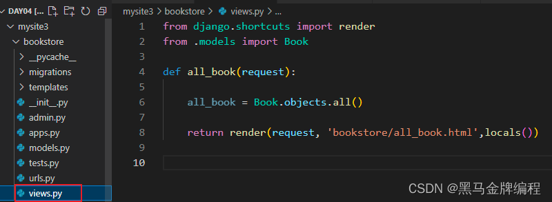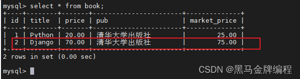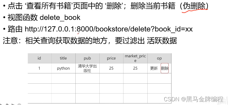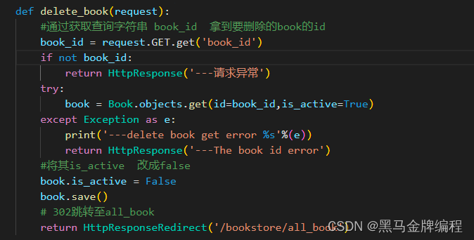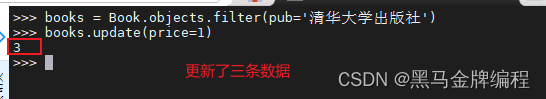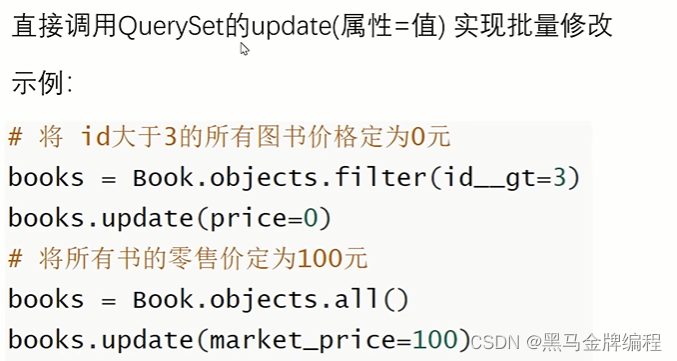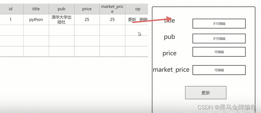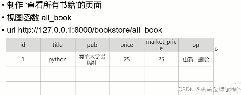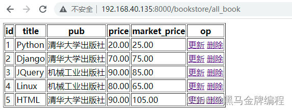 点击“查看所有书籍”页面中的‘更新’进入更新页面 def update_book(request,book_id):#bookstore/update_book/1try:book = Book.objects.get(id=book_id)except Exception as e:print('--update book error is %s'%(e))return HttpResponse('--The book is not exitsted')if request.method == 'GET':return render(request,'bookstore/update_book.html',locals())elif request.method == 'POST':price = request.POST['price']market_price = request.POST['market_price']#改book.price = pricebook.market_price = market_price#保存book.save()return HttpResponseRedirect('/bookstore/all_book') update_book.html