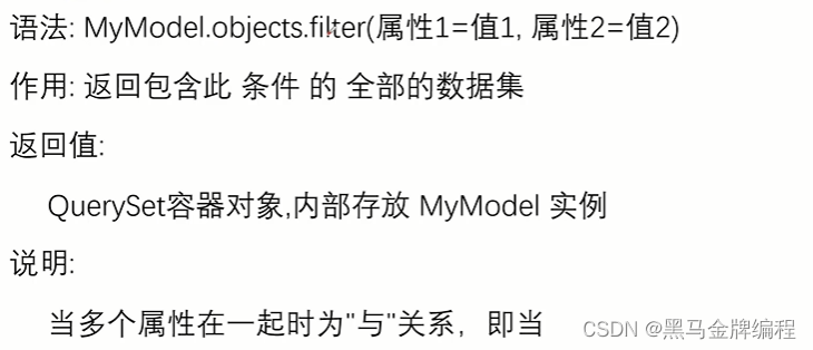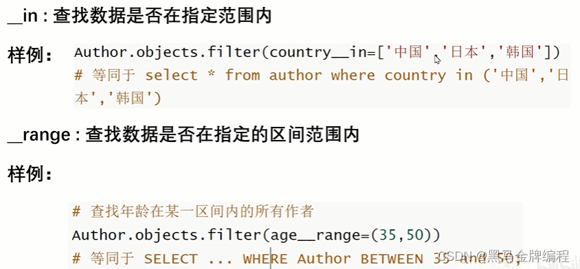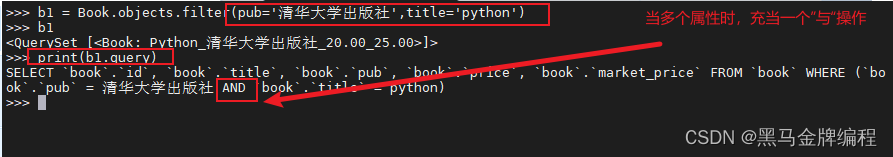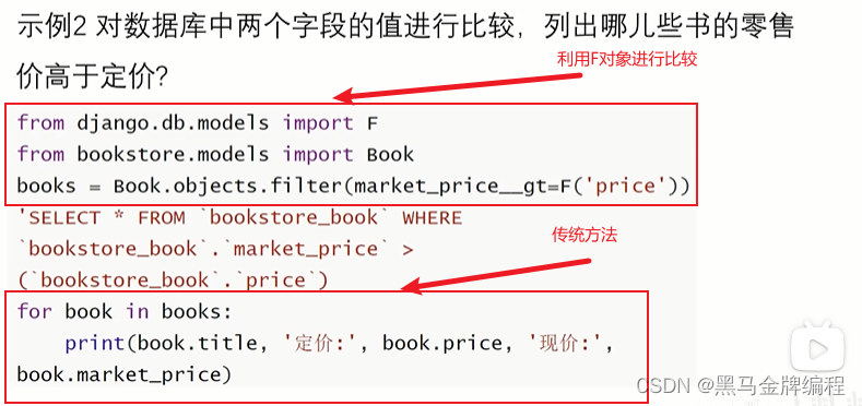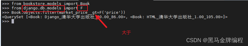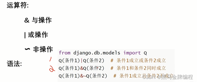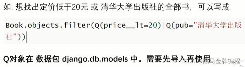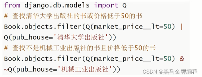 结论:传统的方法需要取出值才能比较,F对象则省略取值步骤直接比较,效率高。 Q对象 当在获取查询结果集 使用复杂的逻辑或 |、逻辑非~ 等操作时可以借助与Q对象进行操作。