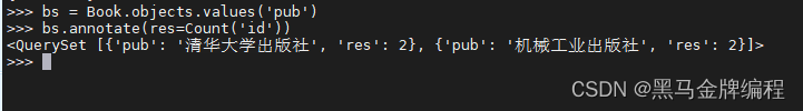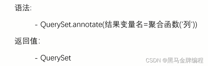 通过返回结果的QuerySet.annotate方法分组聚合得到分组结果 QuerySet.annotate(别名=聚合函数('列名'))