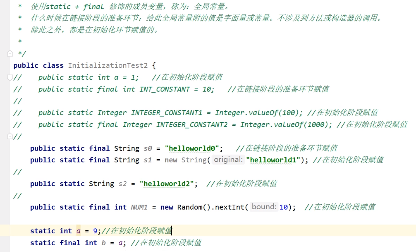 准备(Prepare):为类变量分配内存并且设置该类变量的默认初始值,即零值。这里不包含用final修饰的static,因为final在编译的时候就会分配了,准备阶段会显式初始化;这里不会为实例变量分配初始化,类变量会分配在方法区中,而实例变量是会随着对象一起分配到Java堆中。