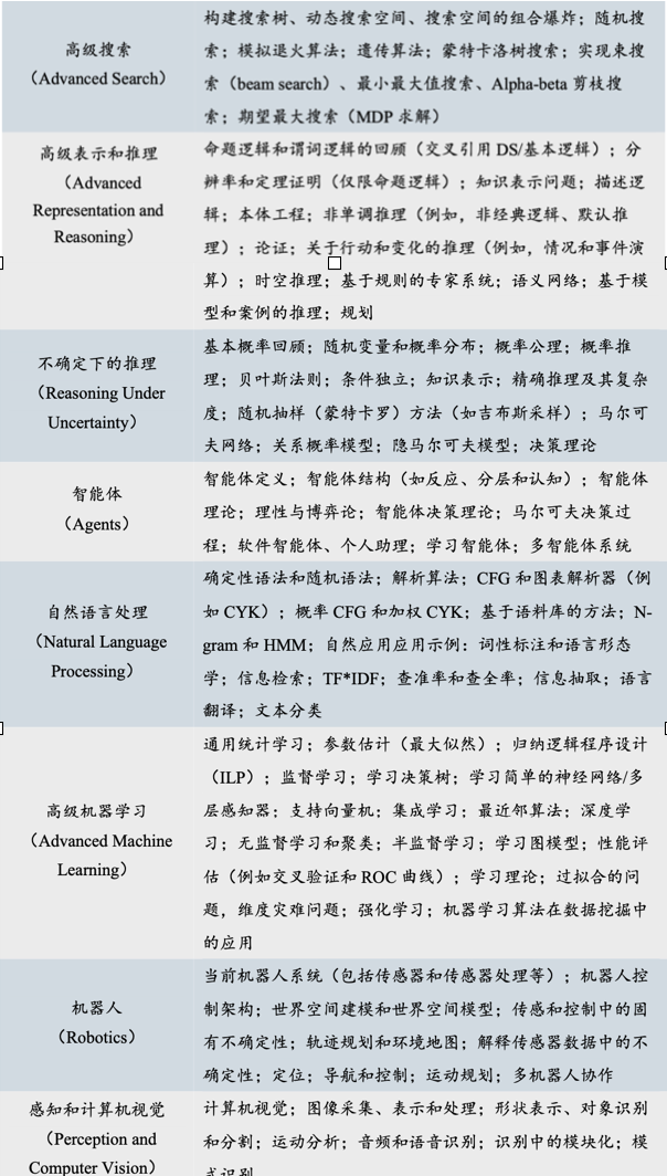 关于人工智能的详细范畴,先请大家看一些信息。首先我们来看ACM和IEEE-CS联合工作组正在制定的人工智能知识模块及知识点。