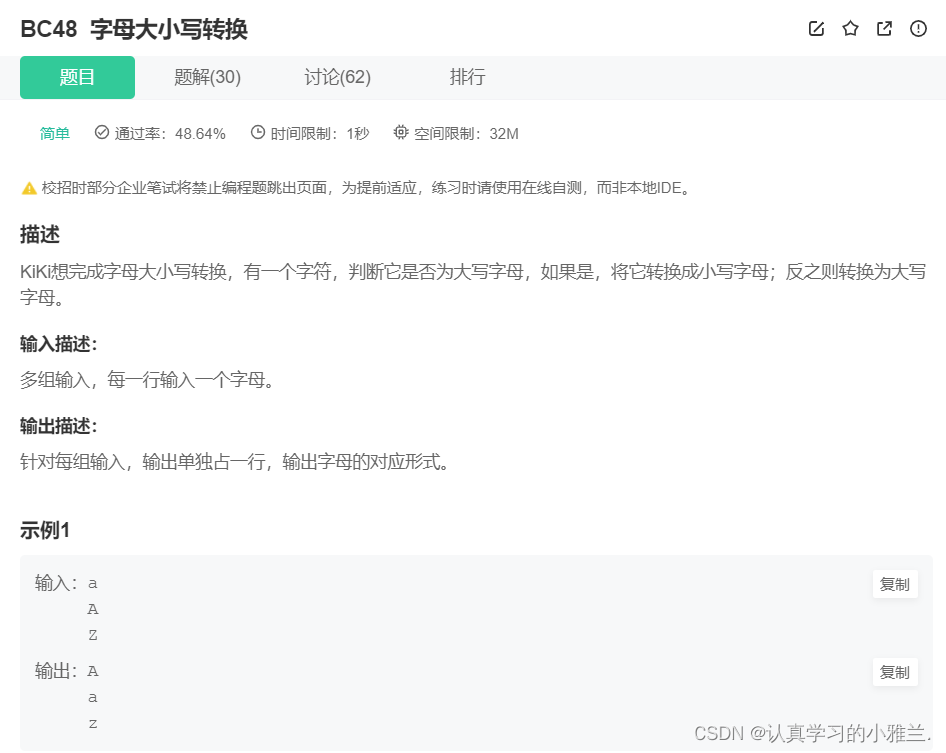 {int ch = 0;//多组输入while ((ch = getchar()) != EOF){if (islower(ch)){printf("%c\n", toupper(ch));}else{printf("%c\n", tolower(ch));}//处理'\n'getchar();}return 0;