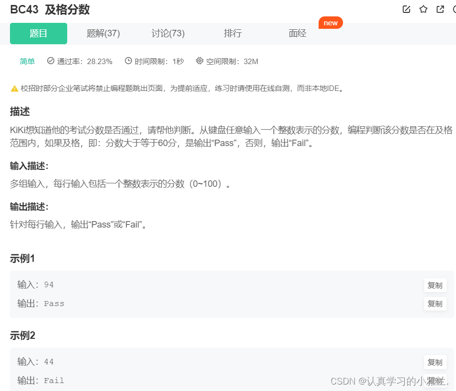 {int score = 0;while (scanf("%d", &score) != EOF){if (score >= 60)printf("Pass\n");elseprintf("Fail\n");}return 0;