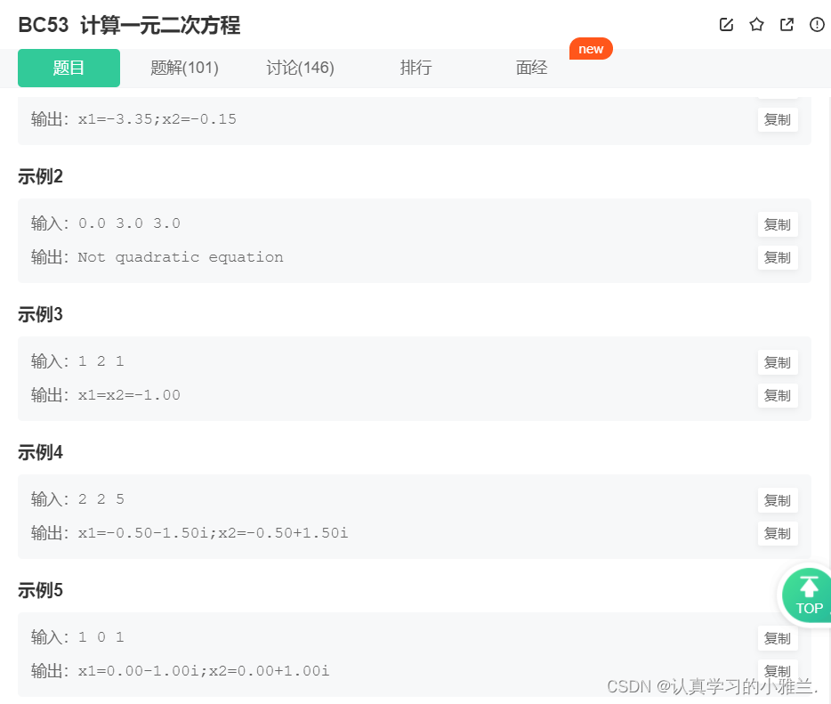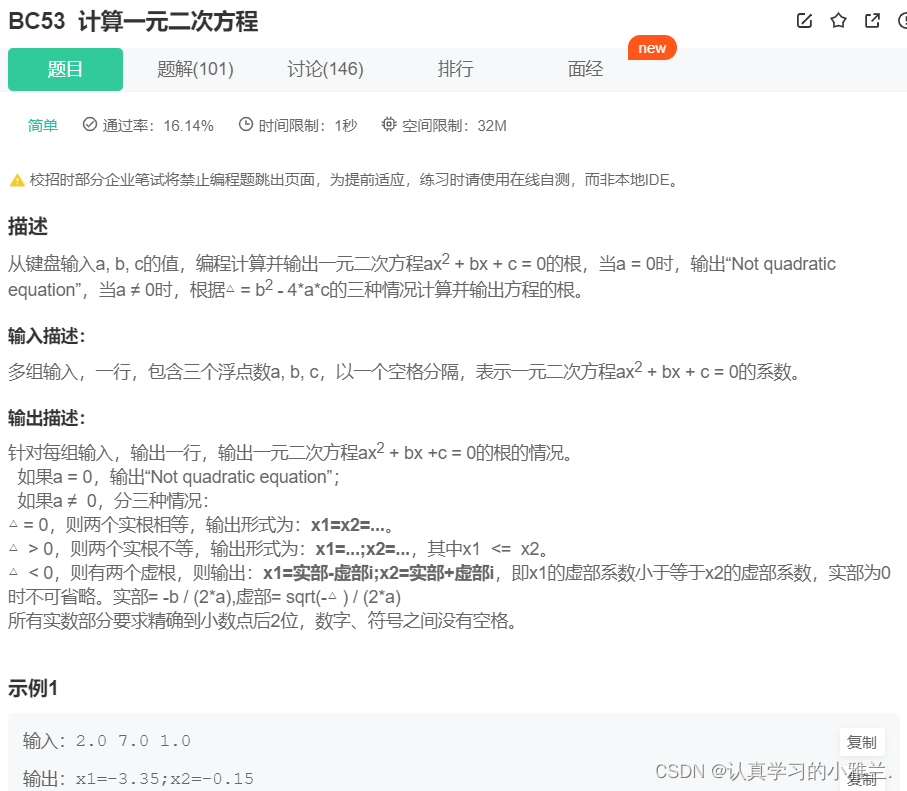 {float a = 0.0;float b = 0.0;float c = 0.0;while (scanf("%f %f %f", &a, &b, &c) != EOF){if (a != 0){float disc = b * b - 4 * a * c;if (disc > 0.0){//有两个不相等的实根printf("x1=%.2f;x2=%.2f\n",(-b - sqrt(disc)) / (2 * a),(-b + sqrt(disc)) / (2 * a));}else if (disc < 0.0){//有两个虚根printf("x1=%.2f-%.2fi;x2=%.2f+%.2fi\n",(-b) / (2 * a), sqrt(-disc) / (2 * a),(-b) / (2 * a), sqrt(-disc) / (2 * a));}else{//有两个相等的实根printf("x1=x2=%.2f\n", (-b) / (2 * a));}}else{printf("Not quadratic equation\n");}}return 0;