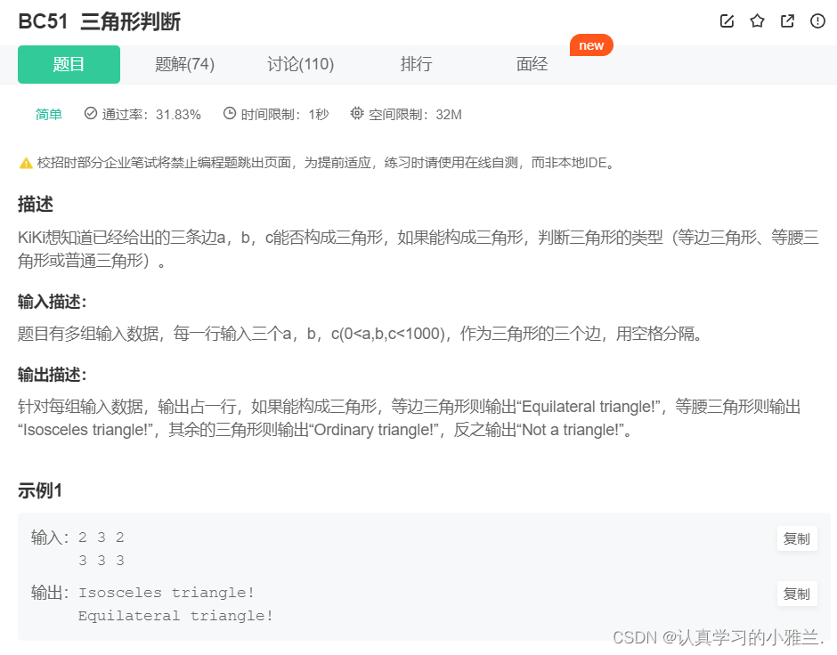 这里就是搞清楚三角形的判断规则,并去一一穷举就行了,因为只有三条边。