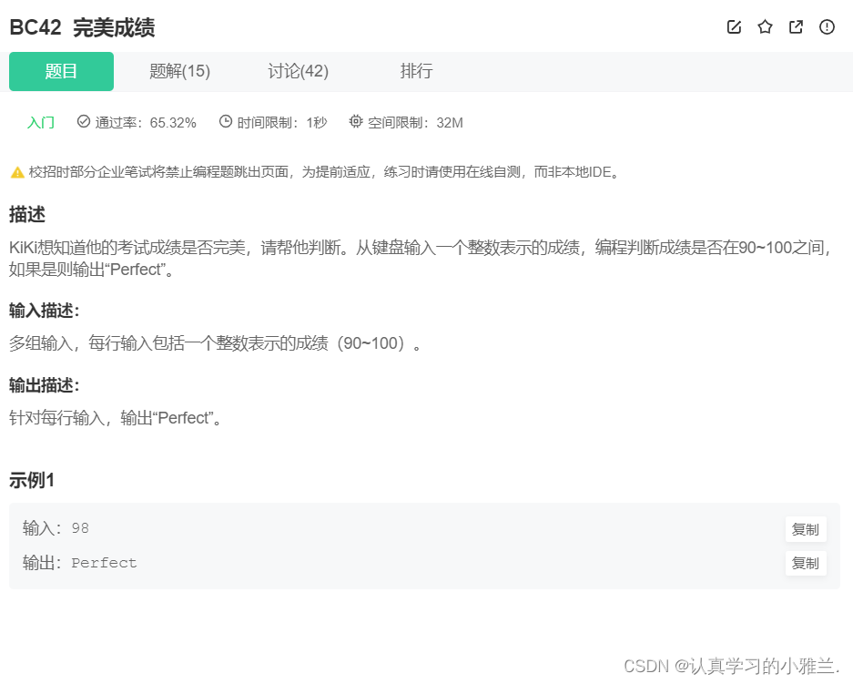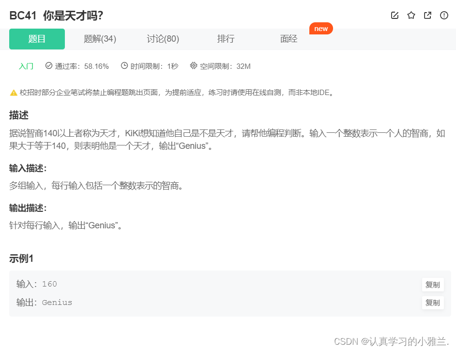 {int n = 0;//这种写法是因为scanf读取失败返回EOF,EOF是-1,所以按位取反后的结果是0,0为假,可以让循环停止。while (~scanf("%d", &n)){if (n >= 140){printf("Genius");}else{printf("不是天才\n");}}return 0;