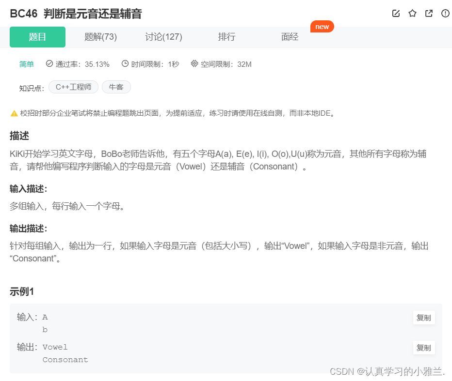 {char ch = 0;char arr[] = "AEIOUaeiou";//在%c的前面写一个空格会消化掉前面所有的空白字符,然后读取一个字符while (scanf(" %c", &ch) != EOF){int i = 0;for (i = 0; i < 10; i++){if (ch == arr[i]){printf("Vowel\n");break;}}if (i == 10)printf("Consonant\n");}return 0;