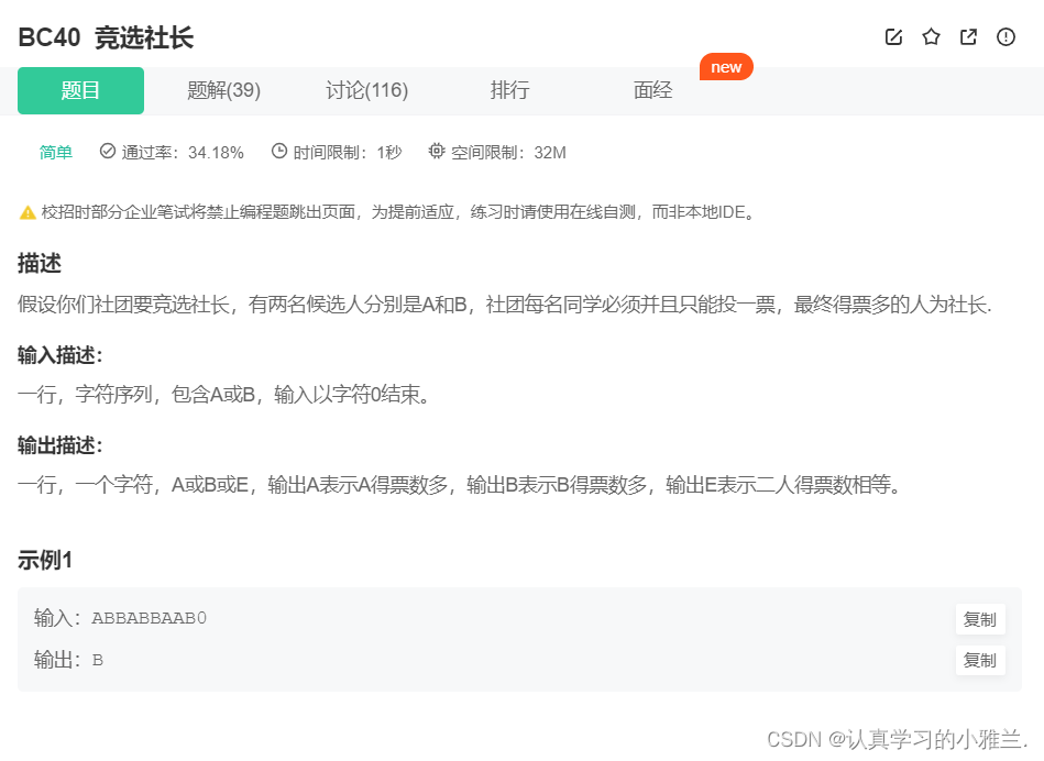 {char arr[100] = { 0 };int ch = 0 ;int flag = 0 ;//如果getchar获取了while (((ch= getchar()) != '0') && ch!= EOF){if(ch=='A'){flag++;}else if(ch=='B'){flag--;}}if (flag > 0){printf("A");}else if (flag < 0){printf("B");}else{printf("E");}return 0;