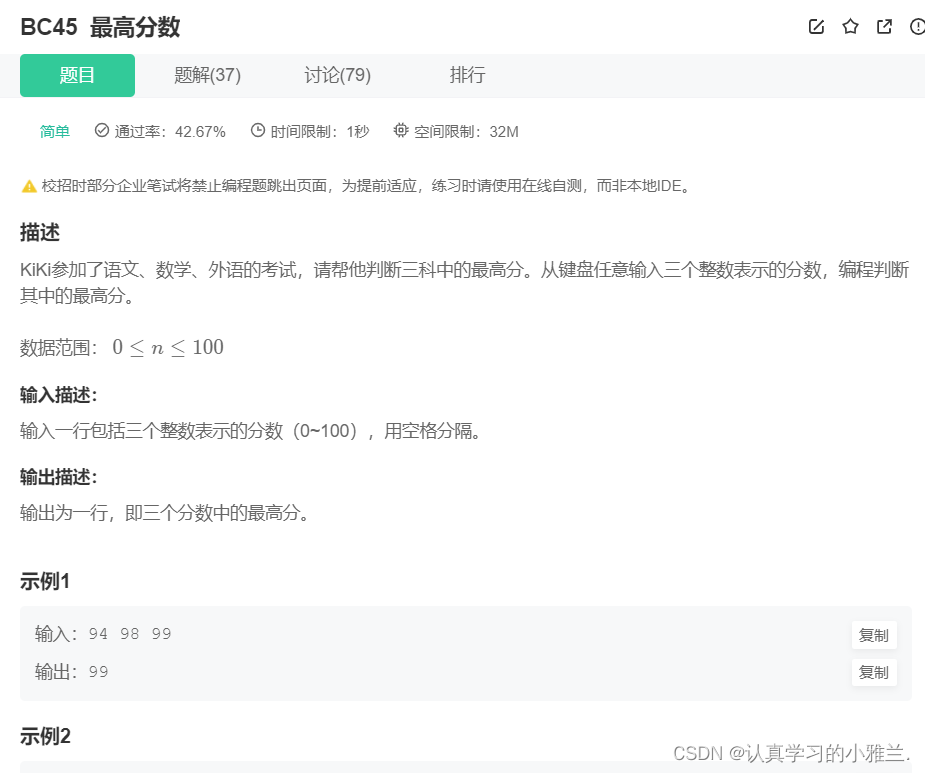 {int i = 0;int score[3] = { 0 };while (scanf("%d %d %d", &score[0], &score[1], &score[2]) != EOF){int max = 0;//每一组测试,max都恢复到0int i = 0;for (i = 0; i < 3; i++){if (score[i] > max)max = score[i];}printf("%d\n", max);}return 0;