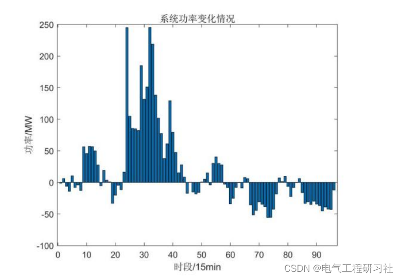 P_{1}(t)其中为机组1在t时段的功率,P_{2}(t)为机组2在t时段的功率,P_{3}(t)为机组3在t时段的功率,P_{wind}(t)为风电在时段的功率,P_{wind-IC}为风电的装机容量,Load(t)为系统在t时段的负荷功率。