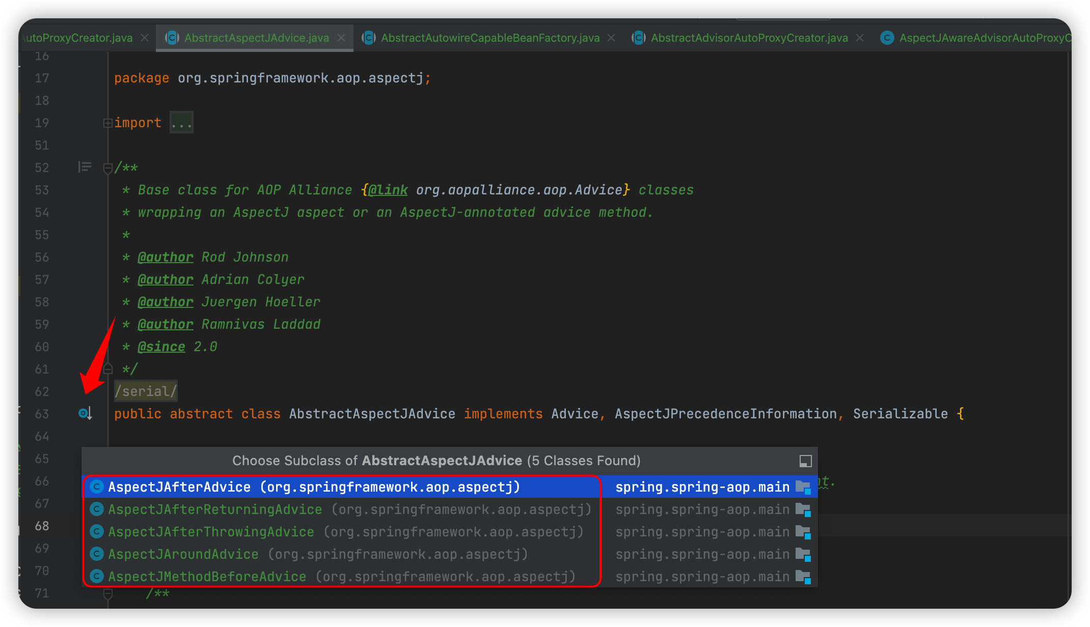 可以看到,抽象类AbstractAspectJAdvic有5个的实现类: