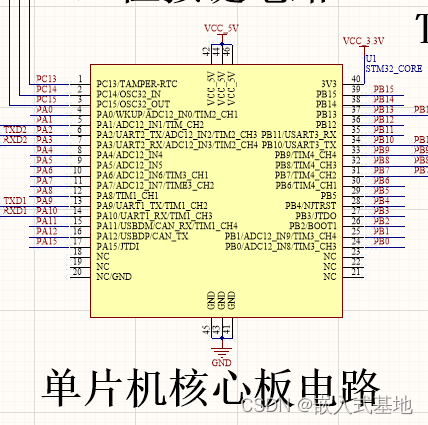 STM32F103C8T6单片机最小系统电路由复位电路、时钟电路和电源电路。拥有这三部分电路后,单片机即可正常工作。