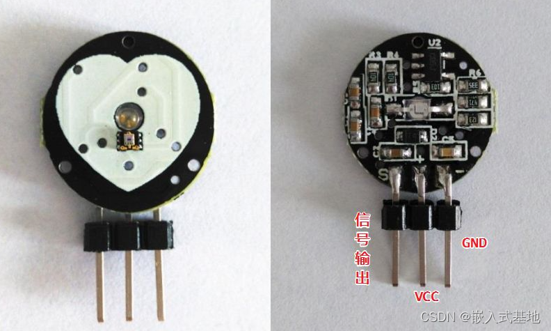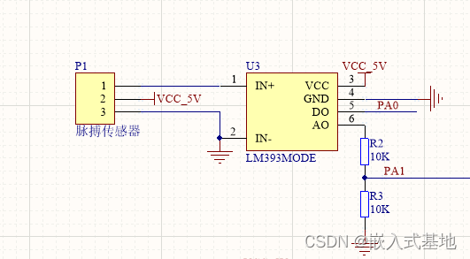 心率检测电路由pulsesensor心率传感器与LM393比较器构成,将DO与AO引脚连接到STM32单片机引脚上,进行数据采集。