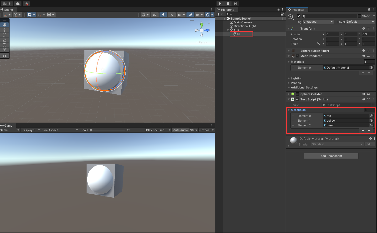 2.把脚本添加在灯节点上,并把三个材质添加到脚本中。