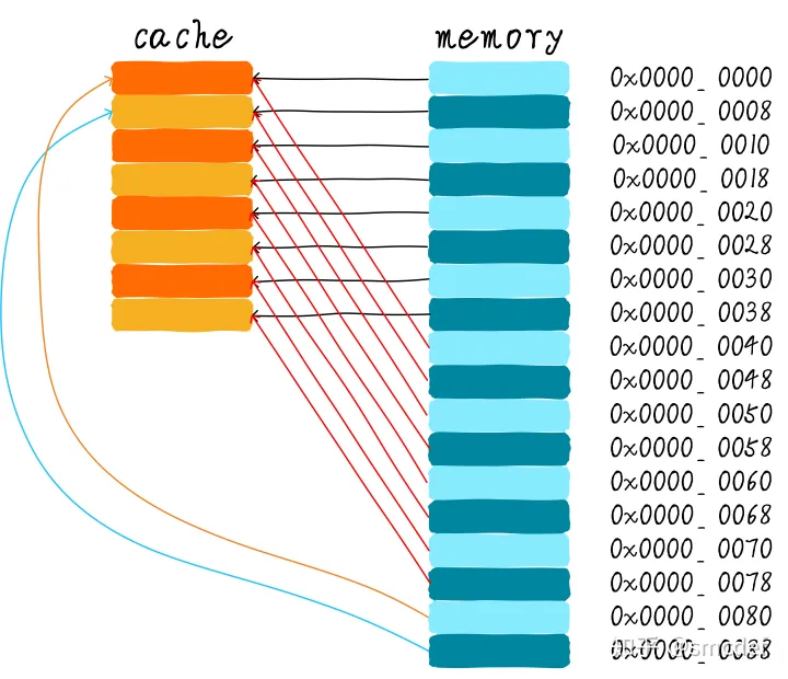 首先我们应该明白0x00、0x40、0x80地址中index部分是一样的,都是0x0。因此,这3个地址对应的cache line是同一个。所以,当我们访问0x00地址时,cache会缺失,然后数据会从主存中加载到cache中第0行cache line。当我们访问0x40地址时,依然索引到cache中第0行cache line,由于此时cache line中存储的是地址0x00地址对应的数据,所以此时依然会cache缺失。然后从主存中加载0x40地址数据到第一行cache line中。同理,继续访问0x80地址,依然会cache缺失。这就相当于每次访问数据都要从主存中读取,所以cache的存在并没有对性能有什么提升。访问0x40地址时,就会把0x00地址缓存的数据替换。这种现象叫做cache颠簸(cache thrashing)。