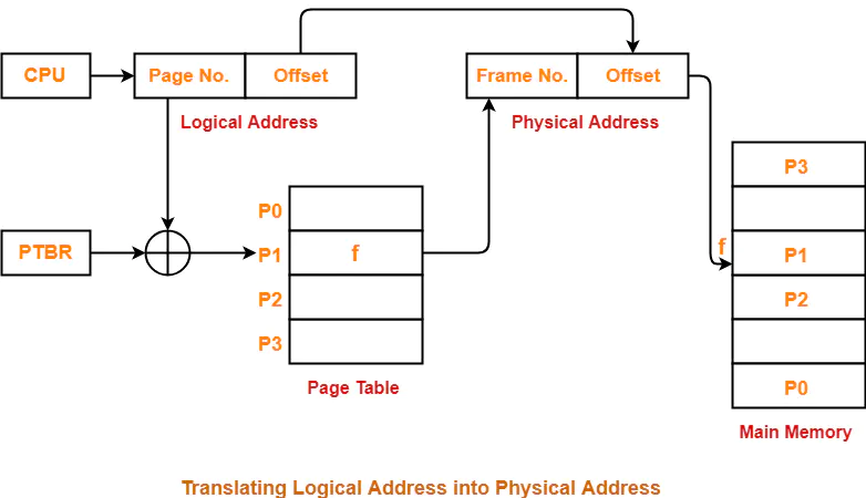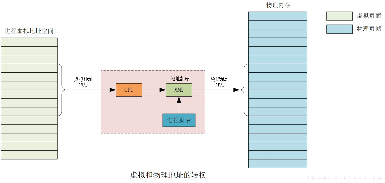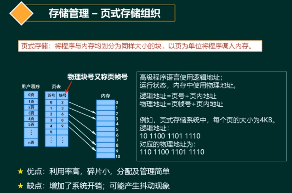 物理地址:内存单元所看到的地址。逻辑地址空间为2^m,且页大小为2^n,那么逻辑地址的高m-n位表示页号,低n位表示页偏移。
