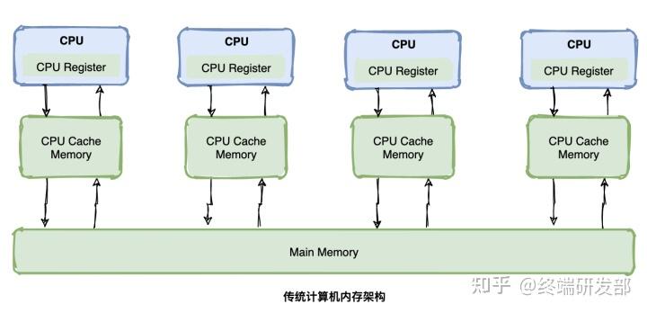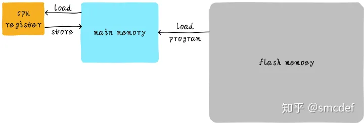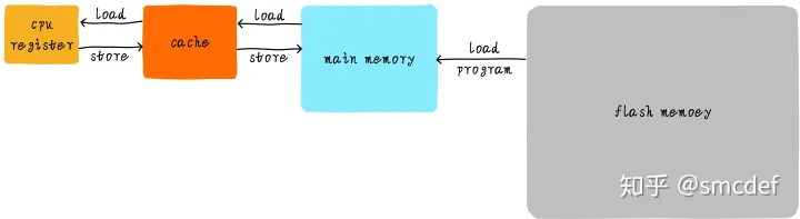 我们应该知道程序是运行在 RAM之中,RAM 就是我们常说的DDR(例如: DDR3、DDR4等)。我们称之为main memory(主存)。当我们需要运行一个进程的时候,首先会从磁盘设备(例如,eMMC、UFS、SSD等)中将可执行程序load到主存中,然后开始执行。在CPU内部存在一堆的通用寄存器(register)。如果CPU需要将一个变量(假设地址是A)加1,一般分为以下3个步骤: