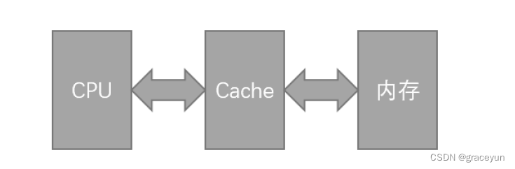 CPU register的速度一般小于1ns,主存的速度一般是65ns左右。速度差异近百倍。因此,上面举例的3个步骤中,步骤1和步骤3实际上速度很慢。当CPU试图从主存中load/store 操作时,由于主存的速度限制,CPU不得不等待这漫长的65ns时间。如果我们可以提升主存的速度,那么系统将会获得很大的性能提升。如今的DDR存储设备,动不动就是几个GB,容量很大。如果我们采用更快材料制作更快速度的主存,并且拥有几乎差不多的容量。其成本将会大幅度上升。我们试图提升主存的速度和容量,又期望其成本很低,这就有点难为人了。因此,我们有一种折中的方法,那就是制作一块速度极快但是容量极小的存储设备。那么其成本也不会太高。这块存储设备我们称之为cache memory。在硬件上,我们将cache放置在CPU和主存之间,作为主存数据的缓存。 当CPU试图从主存中load/store数据的时候, CPU会首先从cache中查找对应地址的数据是否缓存在cache 中。如果其数据缓存在cache中,直接从cache中拿到数据并返回给CPU。当存在cache的时候,以上程序如何运行的例子的流程将会变成如下: