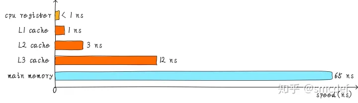 cahe的速度在一定程度上同样影响着系统的性能。一般情况cache的速度可以达到1ns,几乎可以和CPU寄存器速度媲美。但是,这就满足人们对性能的追求了吗?并没有。当cache中没有缓存我们想要的数据的时候,依然需要漫长的等待从主存中load数据。为了进一步提升性能,引入多级cache。前面提到的cache,称之为L1 cache(第一级cache)。我们在L1 cache 后面连接L2 cache,在L2 cache 和主存之间连接L3 cache。等级越高,速度越慢,容量越大。但是速度相比较主存而言,依然很快。不同等级cache速度之间关系如下: