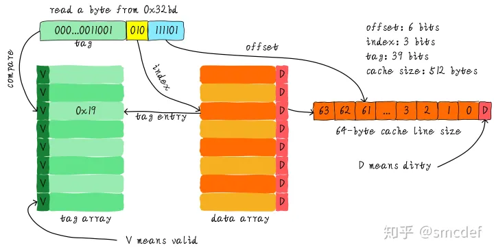 在上述图中,我们看到tag的值是0x19,和地址中的tag部分相等,因此在本次访问会命中。由于tag的引入,因此解答了我们之前的一个疑问“为什么硬件cache line不做成一个字节?”。这样会导致硬件成本的上升,因为原本8个字节对应一个tag,现在需要8个tag,占用了很多内存。
