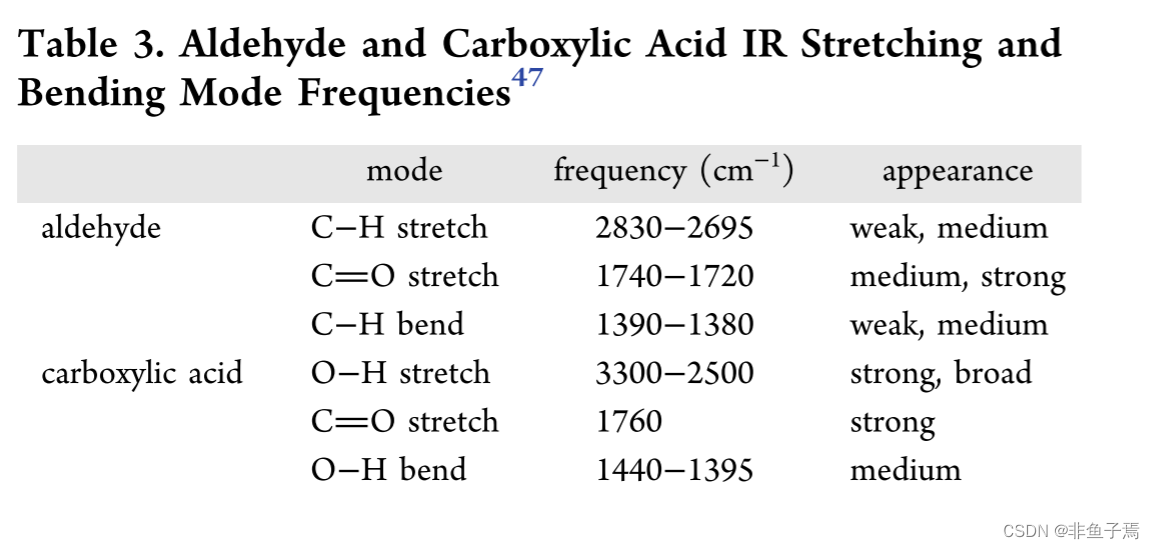 )在有机光谱中通常与其他C-H键重叠,因为它是一个较弱的模式(表3)。在含有多个氧原子的化合物中,羰基伸展也经常无法解析。C-H弯曲模式通常很弱,此外还处于指纹区,由于其复杂性,解释起来是一个挑战。考虑到这些拉伸和弯曲模式,可以合理地预计,醛官能团对于模型在光谱中的识别是具有挑战性的。相比之下,羧酸官能团总是被模型在光谱中正确识别。羧酸的模型是训练有素的。正如验证准确率和交叉熵(表2)所观察到的,羧酸模型对它从未观察过的光谱有更强的转移性。我们通过对未知光谱的正确分配来证实该模型的有效性。总的来说,有更多的羧酸训练光谱,与醛类相比,红外模式得到了更好的解析,特别是强的COO-H拉伸(表3)。