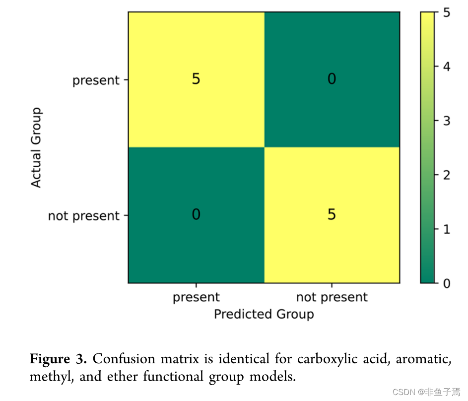 每个模型的混淆矩阵是通过使用训练和测试数据中被扣留的光谱来创建的。混淆矩阵将模型的分配与样品的实际身份进行比较;它显示了沿着矩阵轨迹的正确分配和离开轨迹的错误分配。四个模型有完美的混淆矩阵,来自10个扣留图像的分类,其中五个包含和不包含官能团光谱例子。羧酸、芳香族、甲基和酯类官能团的存在或不存在在扣留光谱中被正确识别(图3)。
