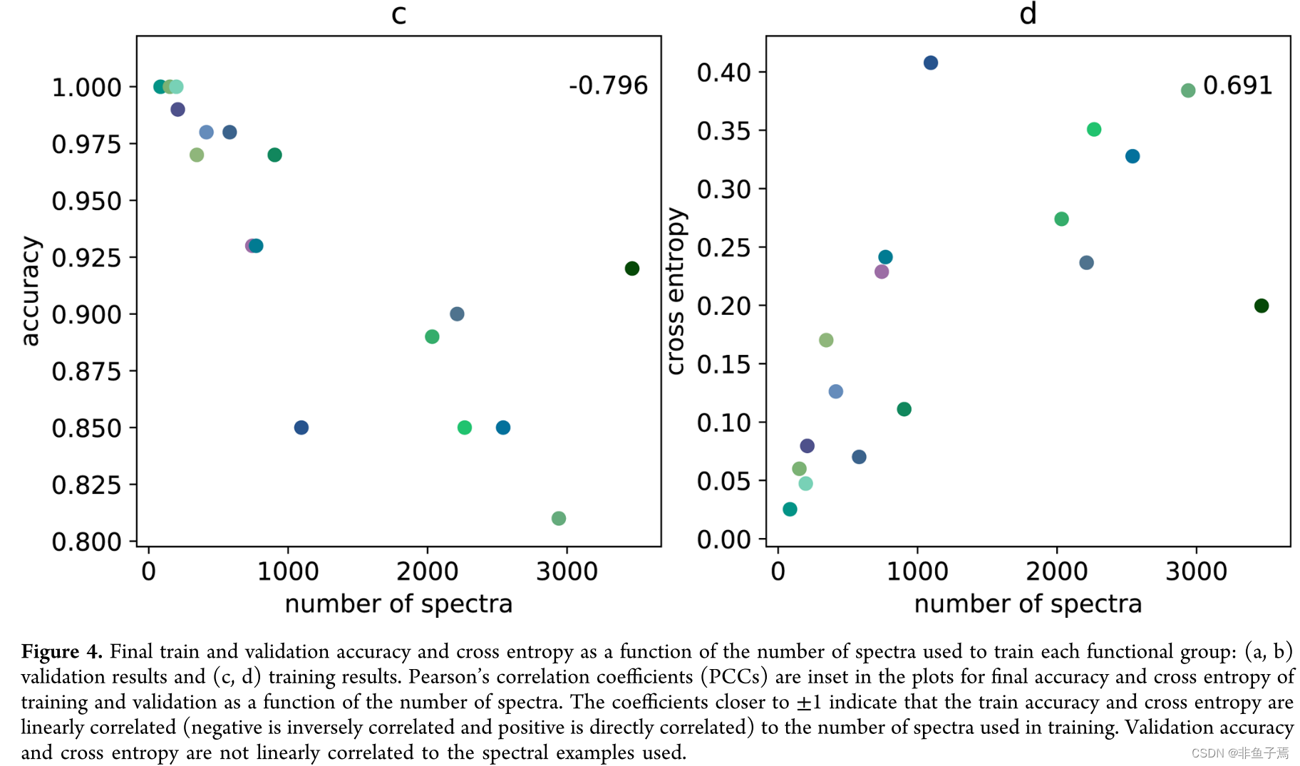 然而,从我们的结果来看,有限的训练光谱的挑战并没有导致更准确的模型。我们通过调查每类图像的数量与验证准确性和交叉熵的关系来证实这一点(表2)。有更多光谱可供训练的模型,其总体训练精度较低,但在分析未知光谱时仍表现良好。为了研究用于训练的光谱数量与最终准确率和交叉熵之间的线性相关关系,采用了皮尔逊相关系数(图3)。更为线性相关的关系,其系数更接近于1,正系数表示正相关,负系数表示负相关。训练精度和训练光谱数量的系数表明它们是间接相关的,而训练交叉熵和训练光谱数量的系数是正的或正相关的。然而,训练谱系较少的模型显示最终准确度和未知谱系的分类能力之间没有相关性。此外,验证准确率和交叉熵都没有明显的线性相关关系。虽然训练结果显示与图像数量相关,但验证数据表明,模型在一定范围的训练光谱数量下是成功的。