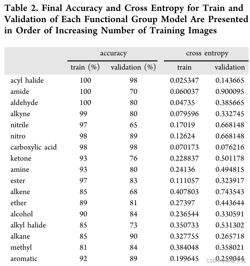 我们使用9000个气相傅立叶变换红外光谱,使用基于图像的ML训练17个官能团模型。我们的方法产生了15个有效识别的功官能团(表2)。每个模型都是独立训练的。当一个分子有一个以上的官能团存在时,相关官能团的模型将从光谱中识别出其存在,从而形成对15个训练过的官能团的完整分析。报告了训练和验证过程中最后一步训练的准确度和交叉熵结果。根据对未经训练的光谱的模型预测,表现不佳的两个官能团模型是醛和腈。我们把表现不佳定义为错误识别60%以上的测试案例。训练准确率是衡量模型对训练数据分类的程度,这些数据被用来训练网络。较高的训练精度表明模型正在学习训练谱系。验证准确率表示模型对未训练光谱的归纳能力,它由正确分类的验证光谱的数量决定。因此,尽管不是一个成功的推断模型的要求,但有更高的验证准确率是更有意义的。交叉熵是用于评估最终模型的损失函数,被定义为正确分配的可能性的对数。较小的交叉熵值表明一个模型训练有素。我们观察到,训练的交叉熵比验证的要小。与验证光谱相比,模型更有可能正确推断出已经用于训练和调整权重的光谱。