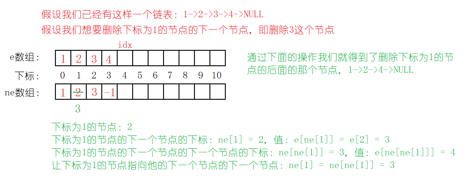 直接让下标为k的节点指向:下标为k的节点的下一个节点的下一个节点就好啦!