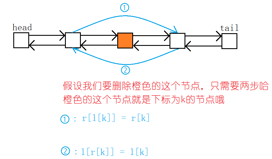 1:l[k]:找到下标为k的节点的上一个节点;r[k]:找到下标为k的节点的下一个节点;r[l[k]] = r[k]:将找到的上一个节点向右连接到找到的下一个节点。