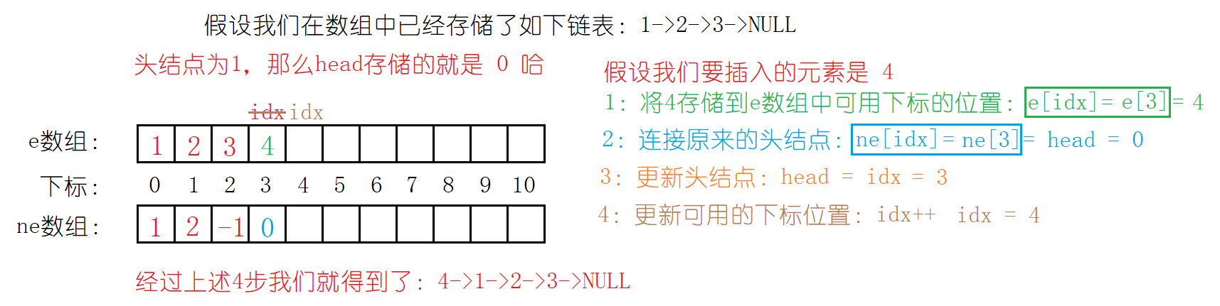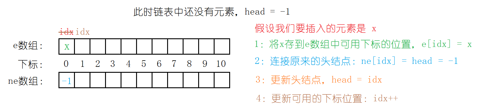 {//存值e[idx] = x;//连接ne[idx] = head;//更新head = idx;idx++;