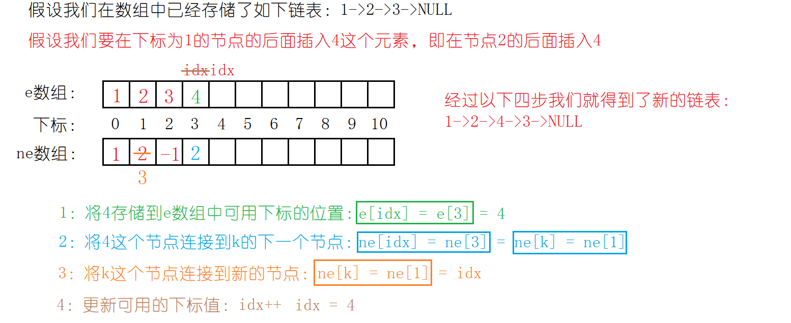 {//将要插入的值存储到e数组e[idx] = x;//将新的节点连接到k节点的下一个节点ne[idx] = ne[k];//将k这个节点连接到新的节点ne[k] = idx;//更新可用的下标值(idx)idx++;