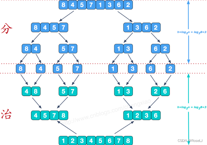 1.将待排序的线性表不断切分成诺干个子表知道每个子表只包含一个元素,这是可以认为包含一个元素的子表是有序表。