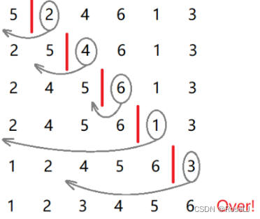 {for (int i = 0; i < n - 1; ++i){//记录有序序列最后一个元素的下标int end = i;//待插入的元素int tem = arr[end + 1];//单趟排while (end >= 0){//比插入的数大就向后移if (tem < arr[end]){arr[end + 1] = arr[end];end--;}//比插入的数小,跳出循环else{break;}}//tem放到比插入的数小的数的后面arr[end + 1] = tem;//代码执行到此位置有两种情况://1.待插入元素找到应插入位置(break跳出循环到此)//2.待插入元素比当前有序序列中的所有元素都小(while循环结束后到此)}