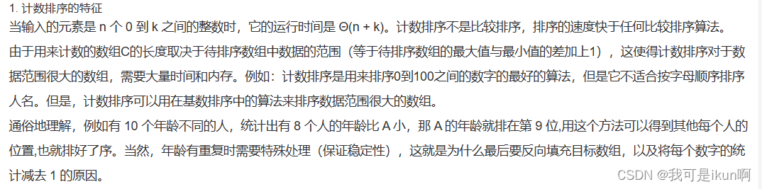 public static void countSort(int[] array) {//1. 遍历数组 找到最大值 和 最小值int max = array[0];int min = array[0];//O(N)for (int i = 1; i < array.length; i++) {if(array[i] < min) {min = array[i];}if(array[i] > max) {max = array[i];}}//2. 根据范围 定义计数数组的长度int len = max - min + 1;int[] count = new int[len];//3.遍历数组,在计数数组当中 记录每个数字出现的次数 O(N)for (int i = 0; i < array.length; i++) {count[array[i]-min]++;}//4.遍历计数数组int index = 0;// array数组的新的下标 O(范围)for (int i = 0; i < count.length; i++) {while (count[i] > 0) {//这里要加最小值 反应真实的数据array[index] = i+min;index++;count[i]--;}}}