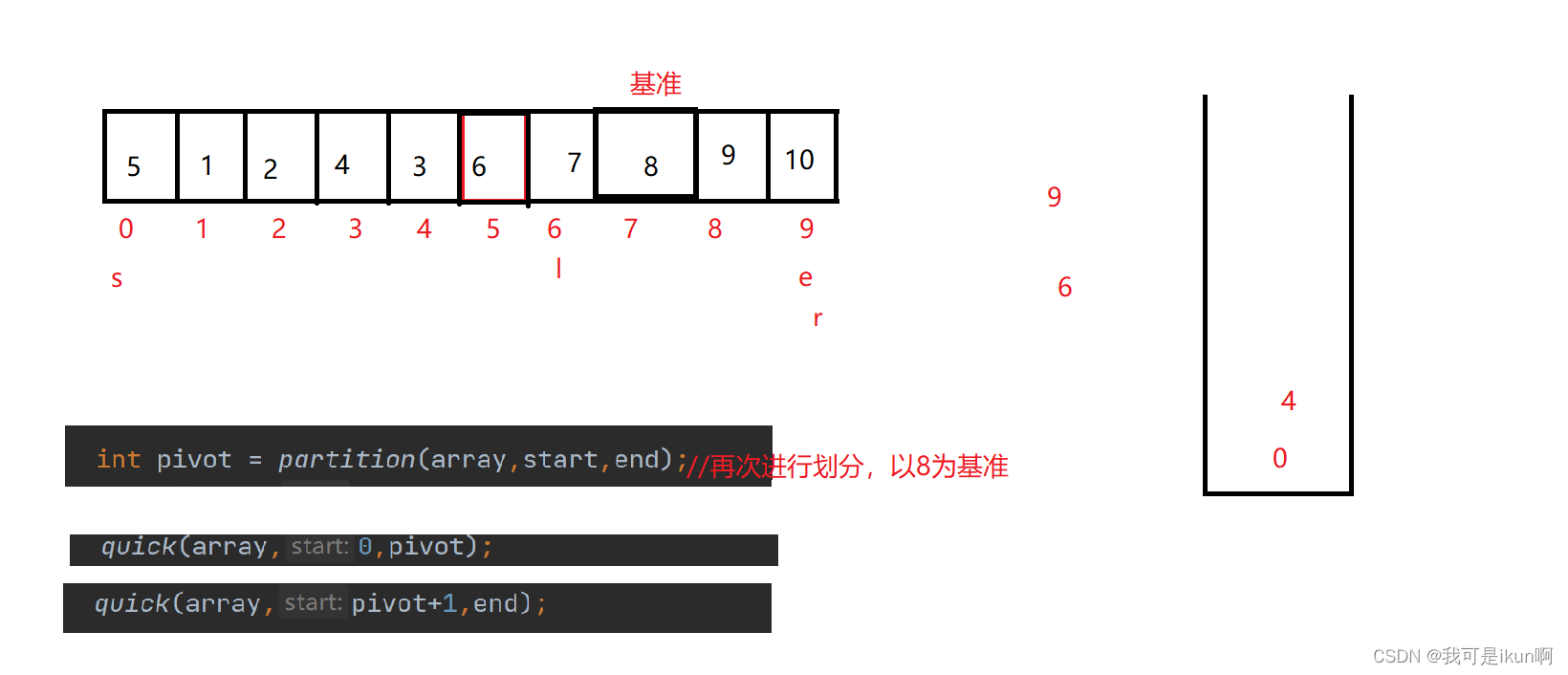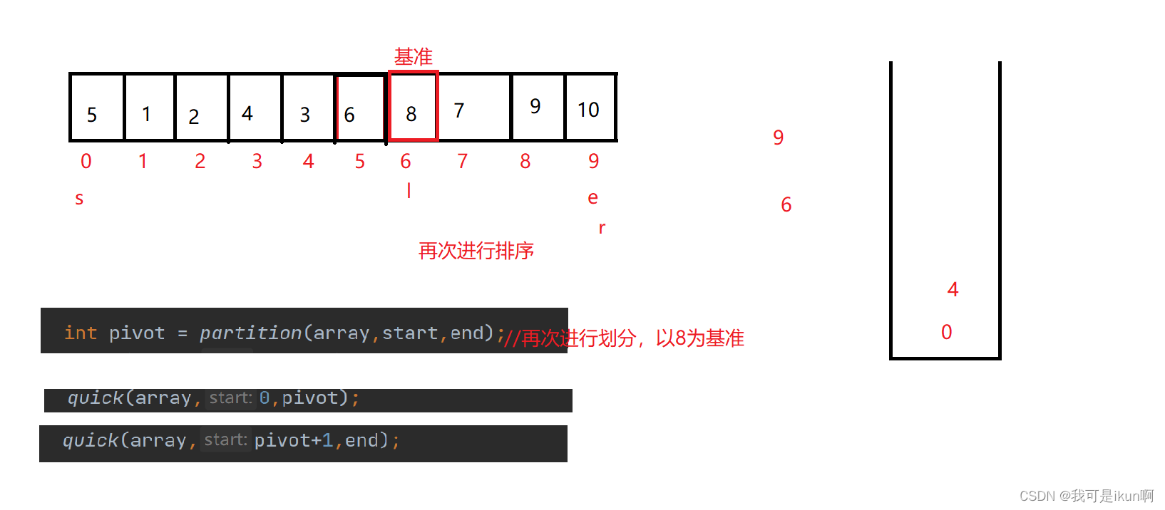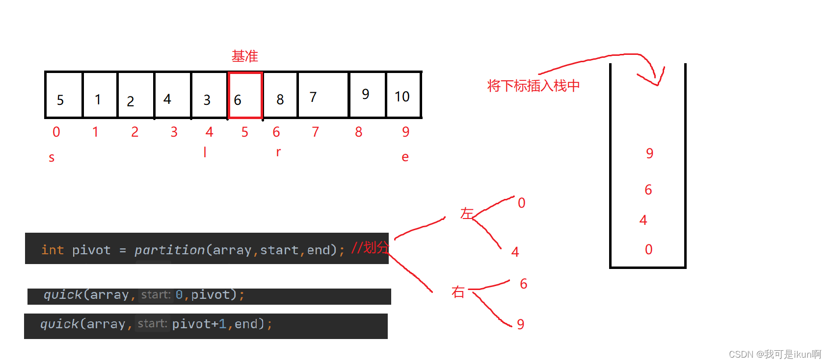 //前后指针法 【了解即可】private static int partition3(int[] array,int left,int right) {int prev = left ;int cur = left+1;while (cur <= right) {if(array[cur] < array[left] && array[++prev] != array[cur]) {swap(array,cur,prev);}cur++;}swap(array,prev,left);return prev;}private static void swap(int[] array,int i,int j) {int tmp = array[i];array[i] = array[j];array[j] = tmp;}