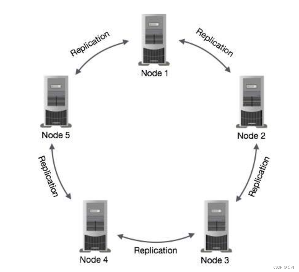 下图显示了Cassandra如何在集群中的节点之间使用数据复制以确保没有单点故障的示意图。
