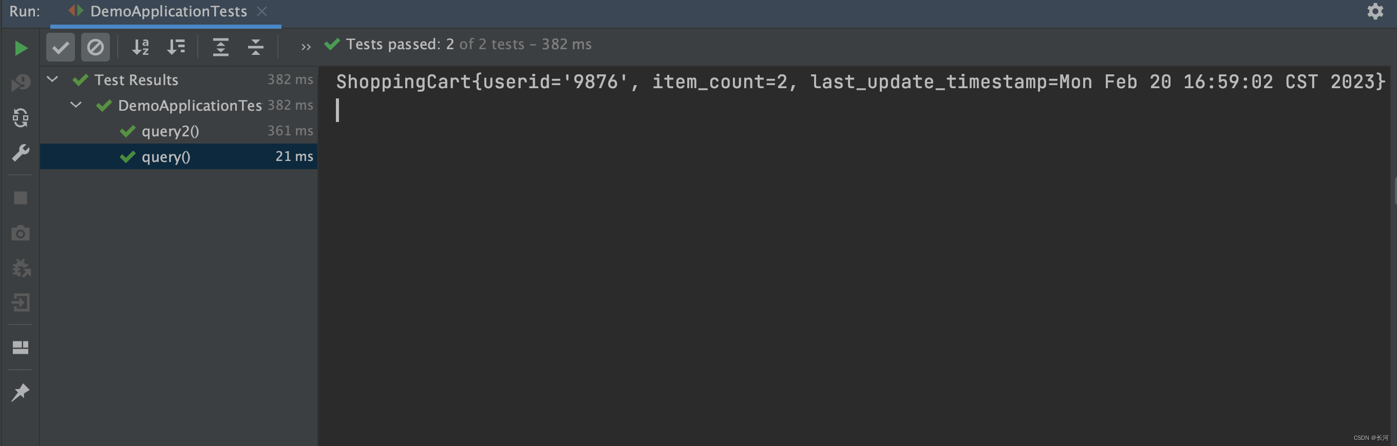class DemoApplicationTests {@Autowiredprivate CassandraTemplate cassandraTemplate;@Testvoid query() {ShoppingCart cart = cassandraTemplate.selectOne("select * from store.shopping_cart", ShoppingCart.class);System.out.println(cart);}@Autowiredprivate ShoppingCartRepo shoppingCartRepo;@Testvoid query2(){List all = shoppingCartRepo.findAll();System.out.println(all);}}