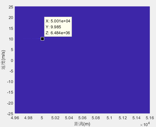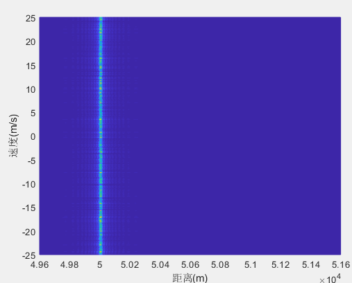 仿真时,考虑某个脉冲的多目标分辨性能。中心载频GHz,脉冲重复间隔1ms,脉宽4us,调频率2.5e12 Hz/s,目标距离50km,速度10m/s。