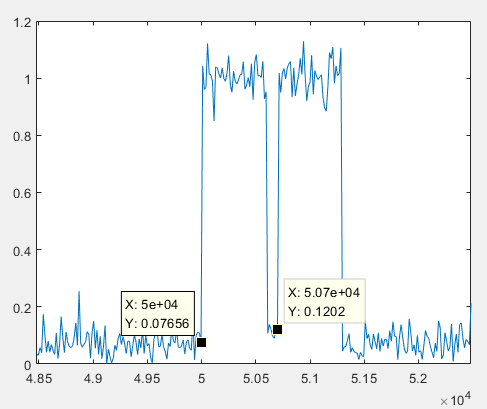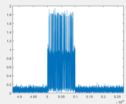 仿真时,考虑某个脉冲的多目标分辨性能。中心载频3GHz,脉冲重复间隔1ms,脉宽4us,目标1距离50km,目标2距离50km+0.7km。脉冲回波信号如下所示,右图为左图脉冲回波的放大图,可以看出距离分辨率由脉宽决定,约为