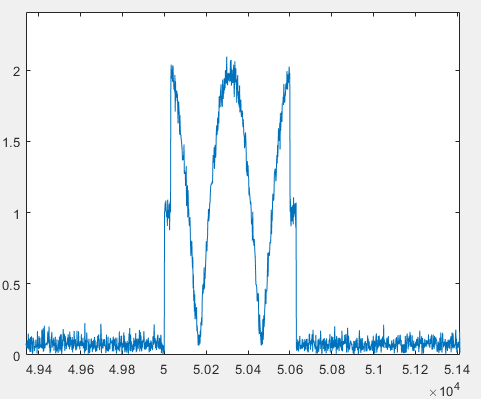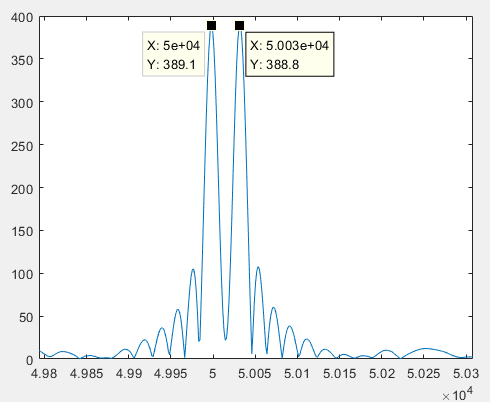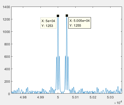 仿真时,考虑某个脉冲的多目标分辨性能。中心载频3GHz,脉冲重复间隔1ms,脉宽4us,调频率2.5e12 Hz/s,目标1距离50km,目标2距离50km+30m。脉冲回波信号如上图所示,右图为左图脉冲回波的放大图,此时目标分辨不出来。下图是经过脉冲压缩后的结果,目标能够分辨,并且距离分辨率由脉冲带宽决定,约为