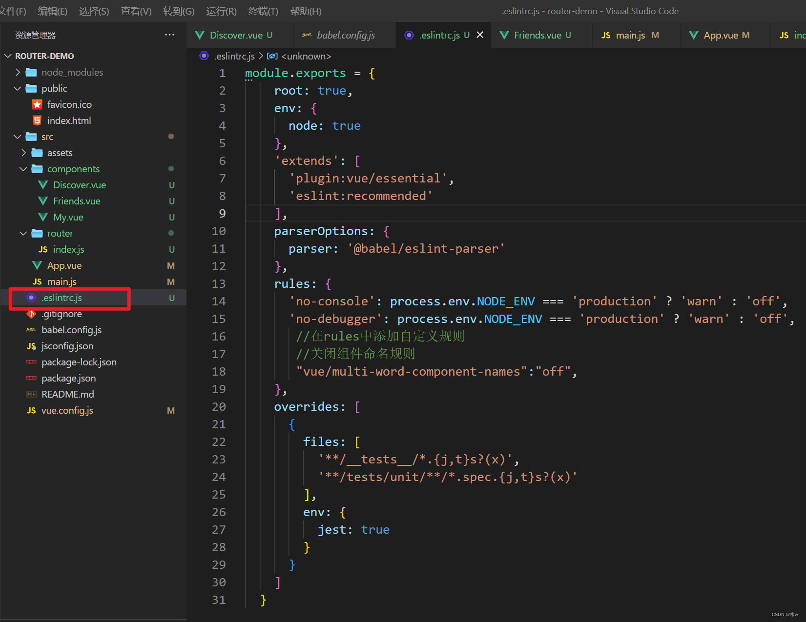 module.exports = {root: true,env: {node: true},'extends': ['plugin:vue/essential','eslint:recommended'],parserOptions: {parser: '@babel/eslint-parser'},rules: {'no-console': process.env.NODE_ENV === 'production' ? 'warn' : 'off','no-debugger': process.env.NODE_ENV === 'production' ? 'warn' : 'off',//在rules中添加自定义规则//关闭组件命名规则"vue/multi-word-component-names":"off",},overrides: [{files: ['**/__tests__/*.{j,t}s?(x)','**/tests/unit/**/*.spec.{j,t}s?(x)'],env: {jest: true}}]}注意:修改完,如果还不行,就退出VsCode,再重新打开项目。