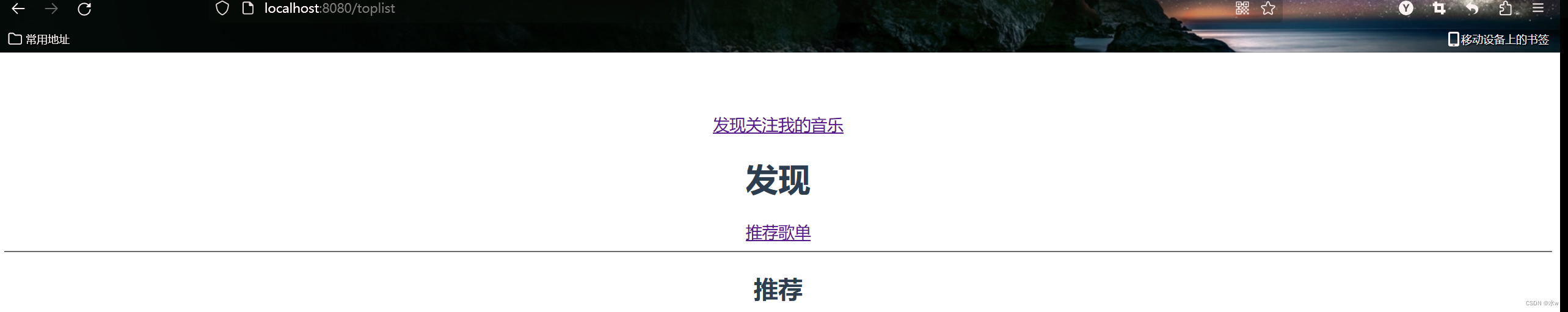 import PlayList from '../components/PlayList.vue'const routes = [//这里需要将根目录默认为Home,方便实现用户在保持登录 状态下再次登录时直接跳转至主页面{path:"/",redirect:{name:"discover"}},{path: "/discover",name: "discover",component:Discover,children: [{path: '/toplist',name: 'toplist',component: TopList},{path: '/playlist',name: 'playlist',component: PlayList}]},{path: "/friends",name: "friends",component:Friends,},{path: "/my",name: "my",component:My,},