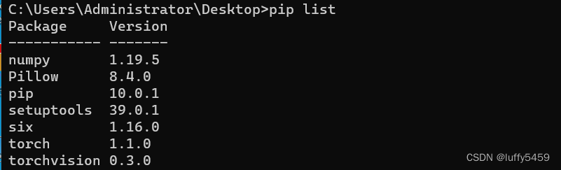 安装的时候直接pip install torch-1.1.0-cp36-cp36m-win_amd64.whl torchvision-0.3.0-cp36-cp36m-win_amd64.whl,最后还会安装torch依赖的numpy six等库。