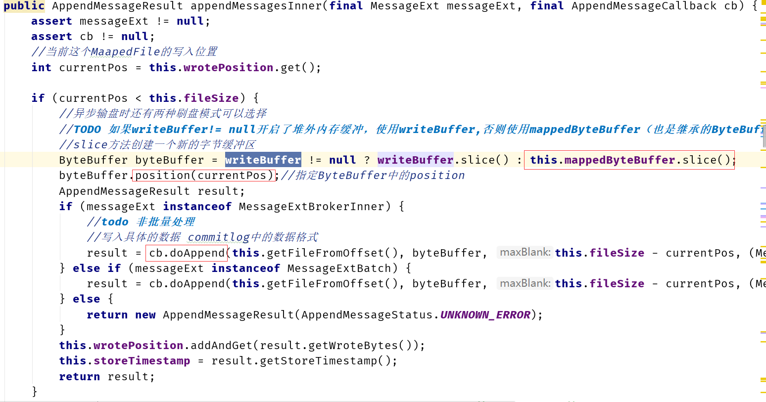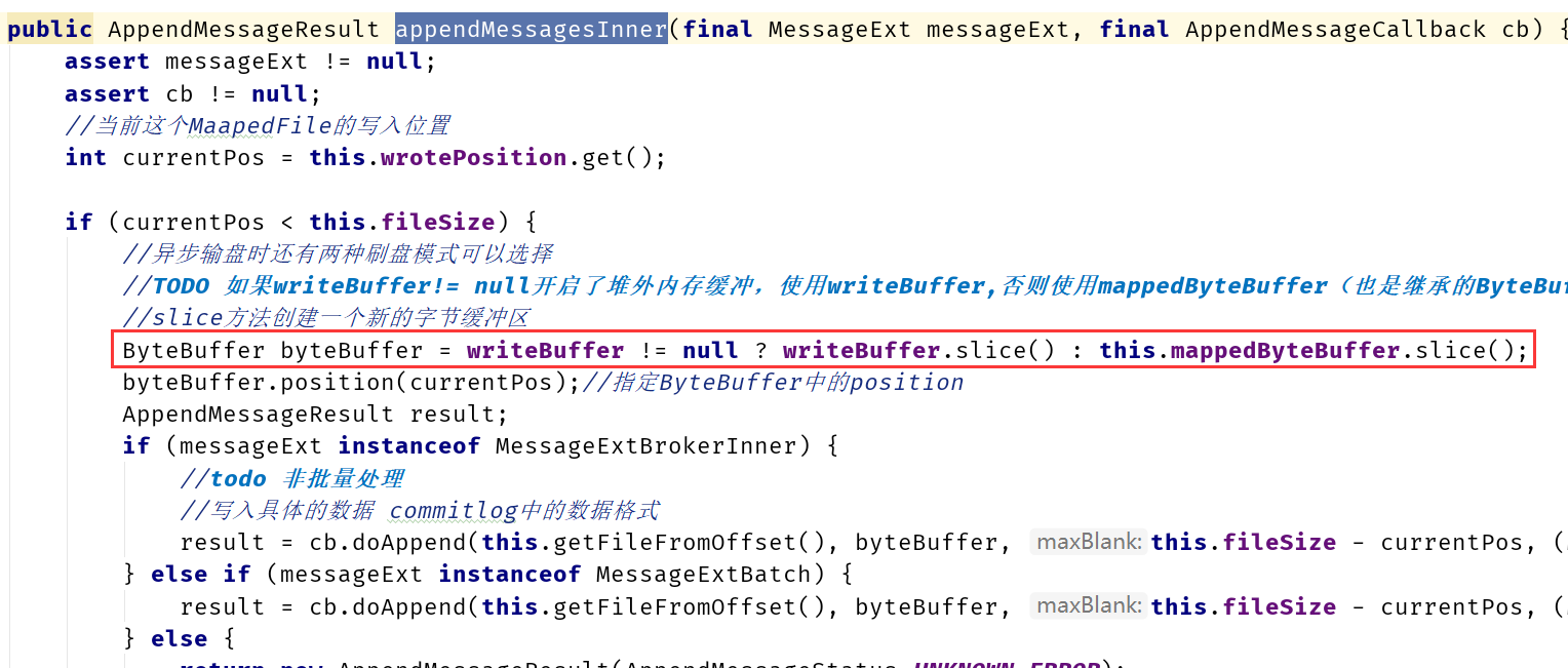 2)从result返回的ByteBuffer中循环读取消息,一次读取一条,创建DispatchRequest对象。如果消息长度大于0,则调用doDispatch方法。最终将分别调用CommitLogDispatcherBuildConsumeQueue(构建消息消费队列)CommitLogDispatcherBuildIndex(构建索引文件)。